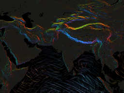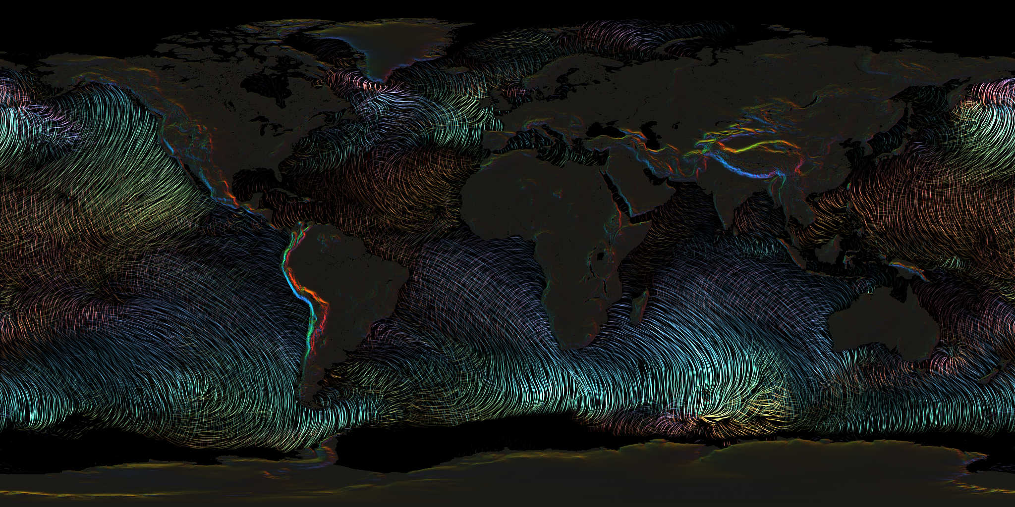 The lines run perpendicular to the direction the swell is moving, just like swell lines in the ocean. The colors vary depending on direction.